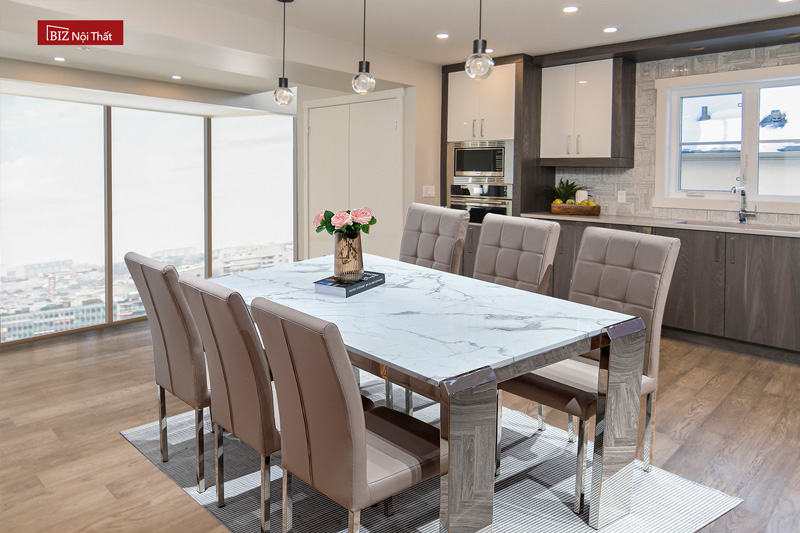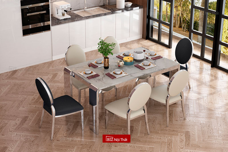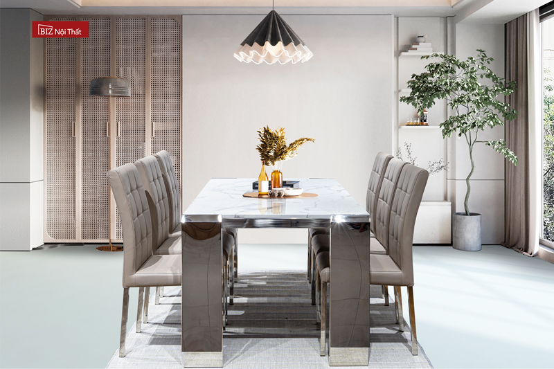 Bàn Ăn Inox mặt đá được coi là một lựa chọn hoàn hảo cho không gian nội thất phòng ăn, giúp cho căn phòng trở nên tiện nghi và sang trọng hơn. Đây không chỉ là nơi để tiếp khách mà còn là nơi để các thành viên trong gia đình cùng ăn uống với nhau, tận hưởng những giây phút nghỉ ngơi, thư giãn sau một ngày học tập và làm việc mệt mỏi. Để có được một không gian hài hòa vừa sang trọng vừa đem đến sự ấm cúng, thoải mái dễ chịu thì gia chủ cũng cần hết sức khéo léo trong việc chọn và kết hợp những món đồ nội thất trong phòng