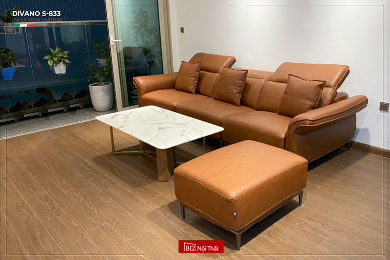 Bàn Giao trọn bộ nội thất tại nhà chị Hà ở Trung Hoà - Hà Nội: Sofa văng 3 chỗ chất liệu da bò Italia Divano S-833 màu nâu Camel & Bàn Ăn Thông Minh mặt gốm Ceramic 2312