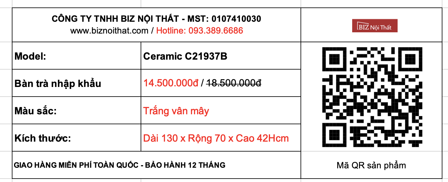 Bàn Trà Mặt Đá Ceramic C21937B màu vân mây cao cấp nhập khẩu được thiết kế hình chữ nhật đầy phong cách mang tính thẩm mỹ cao, màu sắc trang nhã, kiểu dáng đơn giản hiện đại. Đây sẽ là điểm nhấn nổi bật cho phòng khách nhà bạn.