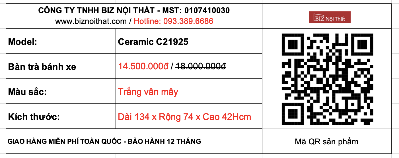 Bàn Trà bánh xe mặt gốm Ceramic-C21925 siêu bền nhập khẩu chính hãng được thiết kế đầy phong cách mang tính thẩm mỹ cao, màu sắc trang nhã, kiểu dáng đơn giản hiện đại. Đây sẽ là điểm nhấn nổi bật cho phòng khách nhà bạn.