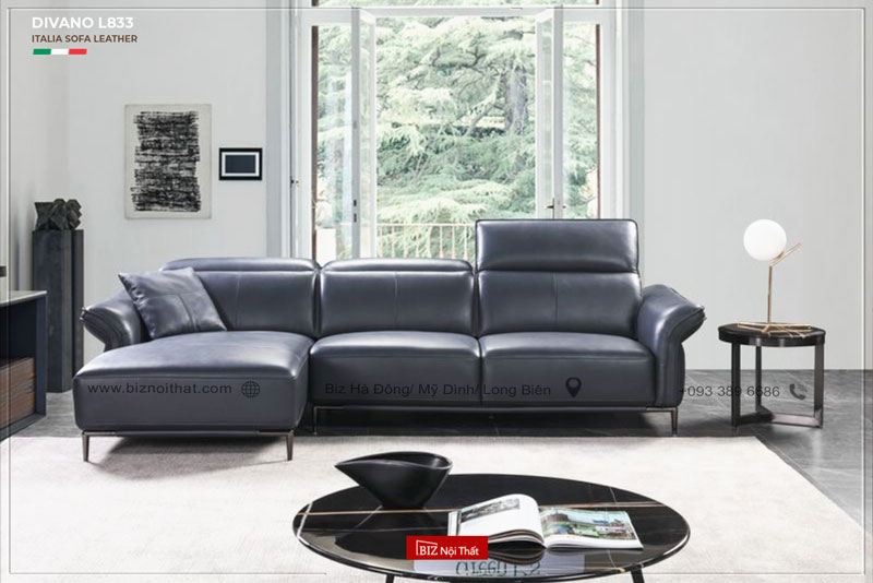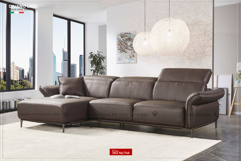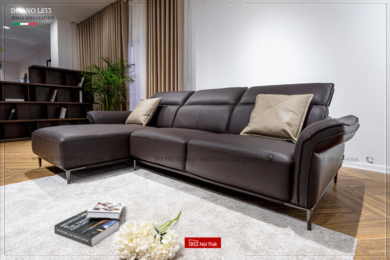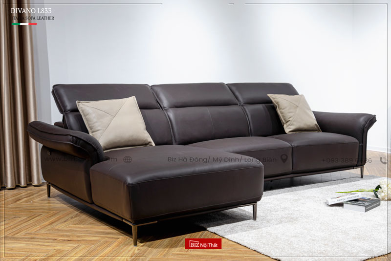 Bộ Sofa góc chất liệu da bò Ý Divano L-833 sử dụng chất liệu da bò thương hiệu GM đến từ Italia với chất lượng & độ bền cực cao. Bền Đẹp mãi theo thời gian. Da bò thật cực dày có tính năng ít thấm nước nên có chất lượng và khả năng chống bụi cao.