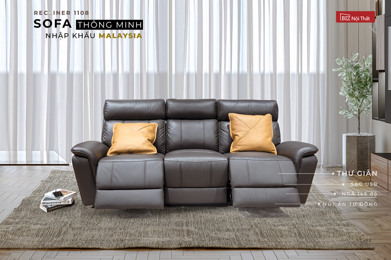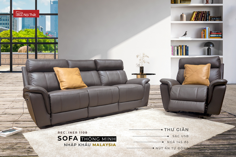 Bộ Sofa thông minh chỉnh điện da thật nhập khẩu Malaysia Recliner M-1108A với phong cách hiện đại, sang trọng, kết cấu vững chãi mang đến sự tiện nghi, êm ái cho phòng khách của gia đình và giúp cho không gian trò chuyện thêm thoải mái, thân thiện.