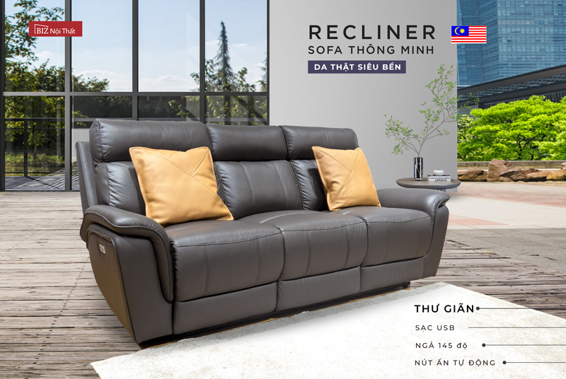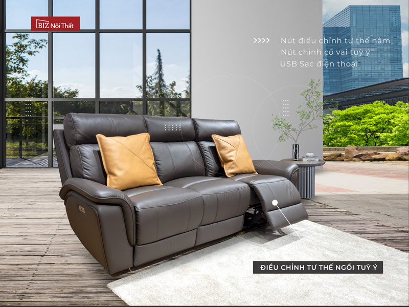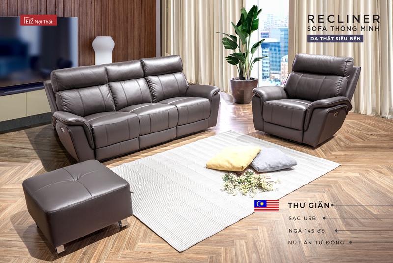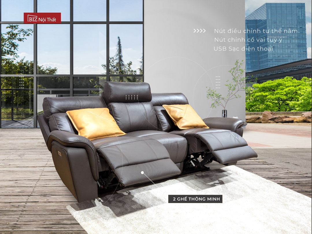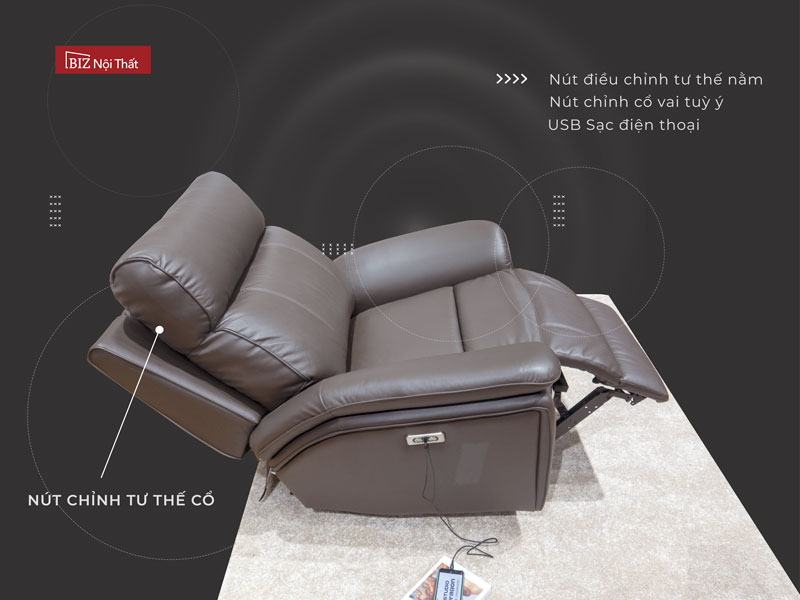 - Tích hợp thêm chức năng recliner chỉnh điện có nút bấm kim loại cao cấp cho ghế Sofa văng 3 chỗ và sofa đơn cho phần cổ