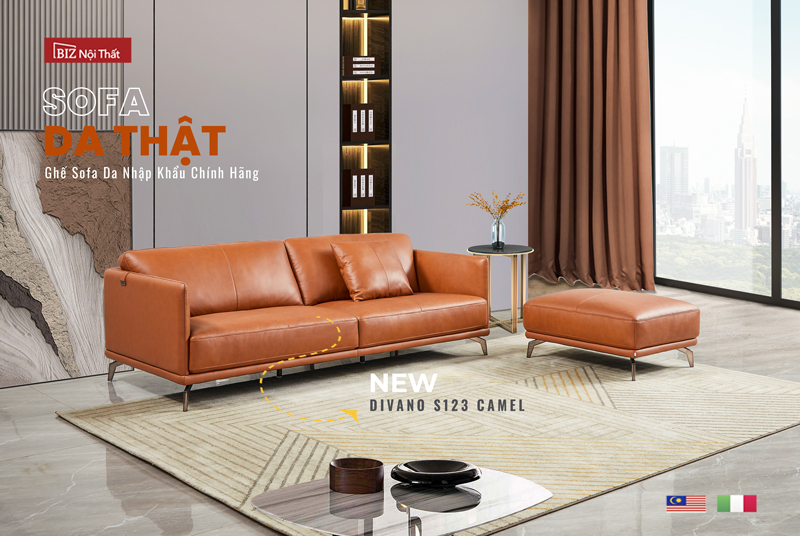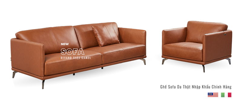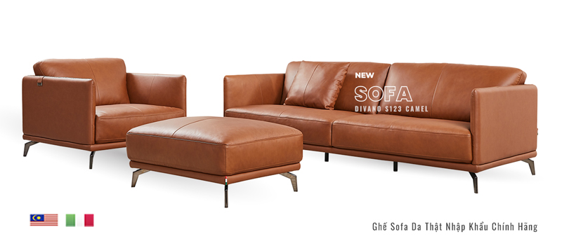 Bộ Sofa văng da thật Italia nhập khẩu Divano S-123 màu Camel sử dụng chất liệu da bò thương hiệu GM đến từ Italia với chất lượng & độ bền cực cao. Bền Đẹp mãi theo thời gian. Da bò thật cực dày có tính năng ít thấm nước nên có chất lượng và khả năng chống bụi cao.