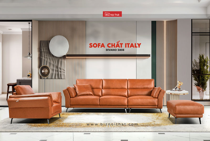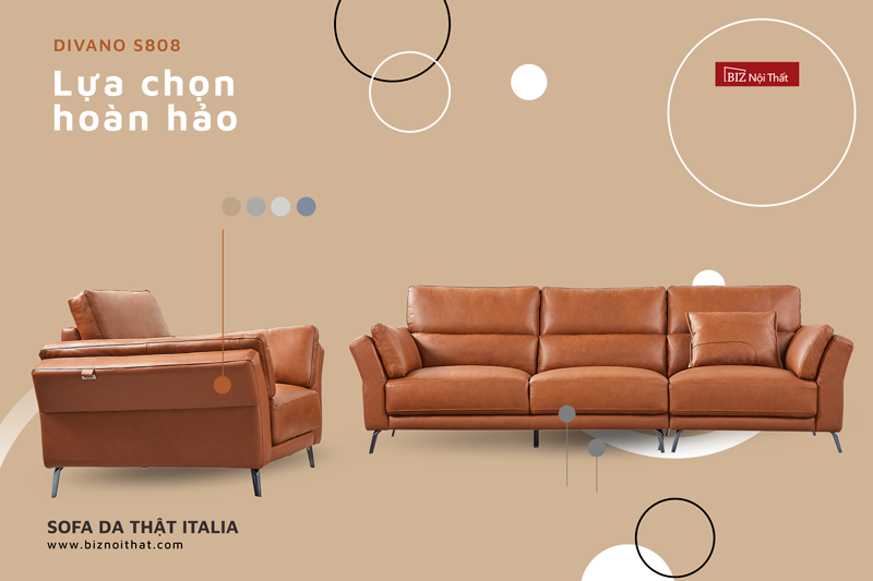 Bộ Sofa Văng chất liệu da bò Ý nhập khẩu Divano S-808 màu Camel sử dụng chất liệu da bò thương hiệu GM đến từ Italia với chất lượng & độ bền cực cao. Bền Đẹp mãi theo thời gian. Da bò thật cực dày có tính năng ít thấm nước nên có chất lượng và khả năng chống bụi cao.