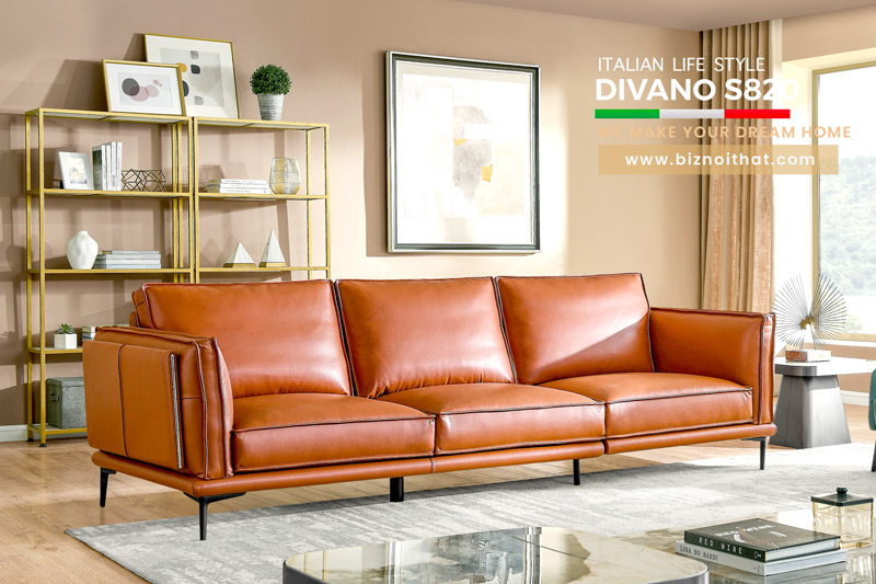 Bộ Sofa văng da bò nhập khẩu Full 100% da bò Divano S820 màu Cam Đậm sử dụng chất liệu da bò thương hiệu GM đến từ Italia với chất lượng & độ bền cực cao. Bền Đẹp mãi theo thời gian. Da bò thật cực dày có tính năng ít thấm nước nên có chất lượng và khả năng chống bụi cao.