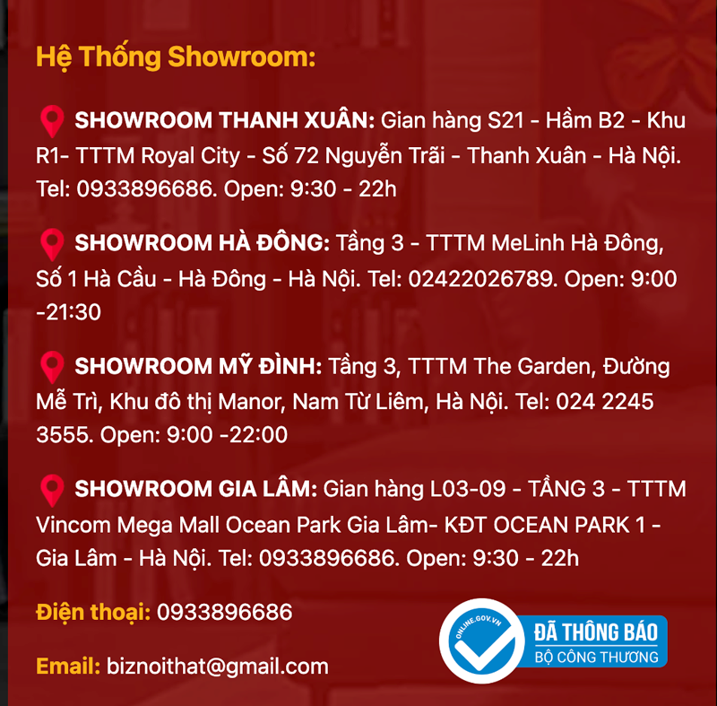 ▪️ Showroom 𝐁𝐢𝐳 Nội Thất Gia Lâm: Tầng 3 - TTTM Vincom Mega Mall Ocean Park (KĐT Ocean Park Gia Lâm, Hà Nội). Tel: 0933896686