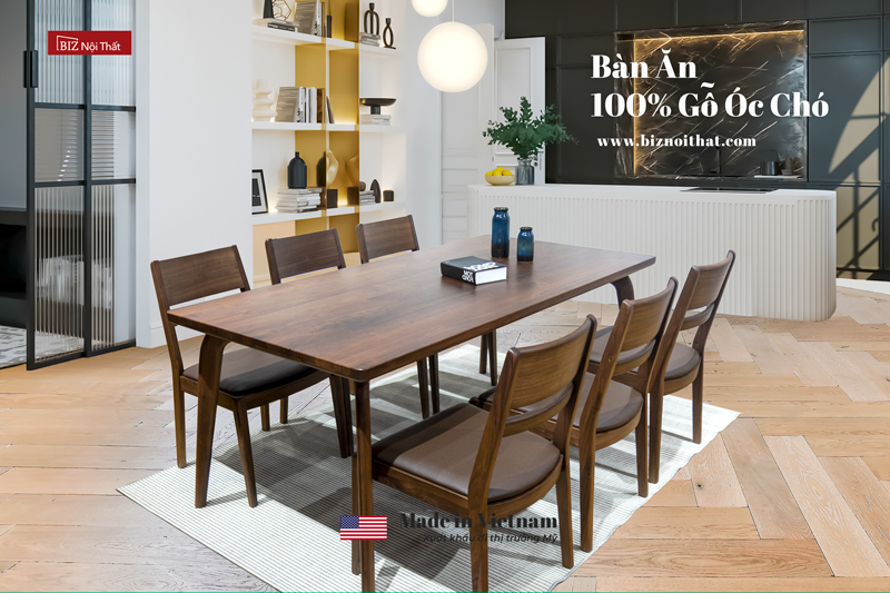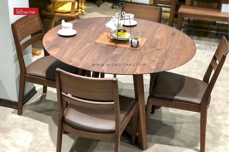 Bộ sản phẩm được làm từ gỗ óc chó tự nhiên đã qua tẩm sấy chống mối mọt, gỗ được sơn màu tự nhiên, bóng mịn, thơm mùi gỗ. Mỗi chiếc ghế đều được làm bằng gỗ tự nhiên dễ lau chùi. Đặc biệt, các cạnh đều được mài nhẵn, không có tính sát thương ngay cả khi những đứa trẻ có đùa nghịch mà vô tình va phải, rất an toàn.