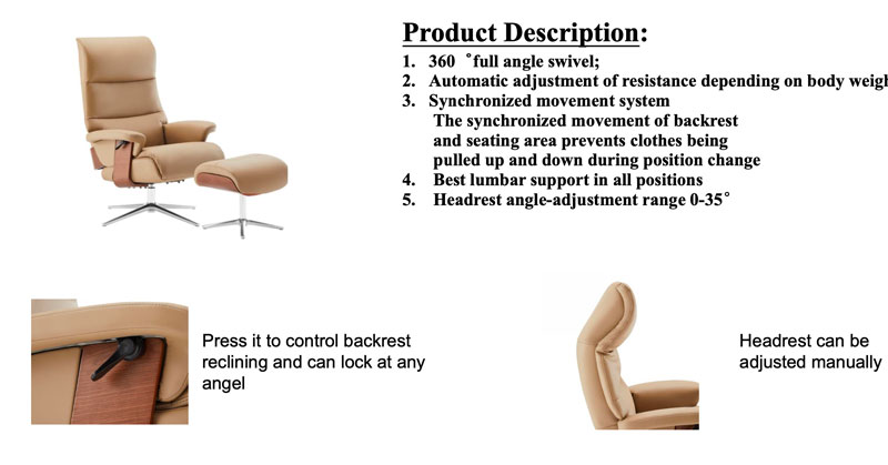 8. Đôn có thể điều chỉnh góc nghiêng hoặc khoá cố định trong phạm vi từ 0° đến 15° (Ottoman adjustable range:15°, Ottoman automatically lock)