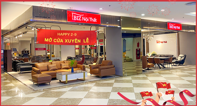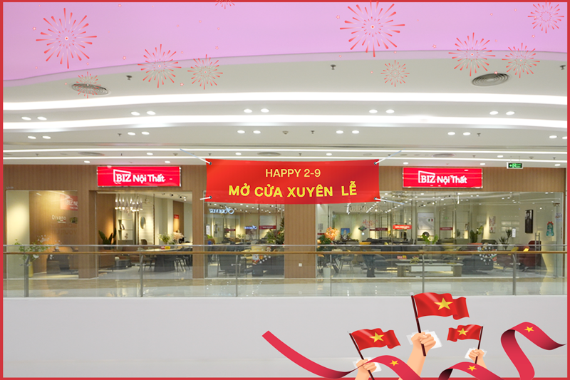 Hưởng ứng tinh thần yêu nước, lòng tự hào dân tộc và mong muốn phục vụ tốt nhất nhu cầu của Quý khách hàng. Toàn bộ cửa hàng trực thuộc hệ thống Siêu Thị Biz Nội Thất sẽ mở cửa phục vụ xuyên Lễ các ngày 𝟑𝟎/𝟖 và 𝟐/𝟗.