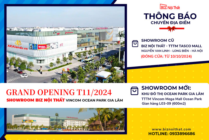 Để phục vụ tốt hơn trải nghiệm mua sắm nội thất cao cấp của Khách Hàng. Biz Nội Thất xin trân trọng thông báo, kể từ ngày 10/10/2024, chúng tôi thay đổi địa chỉ Showroom trưng bày Nội Thất như sau:
