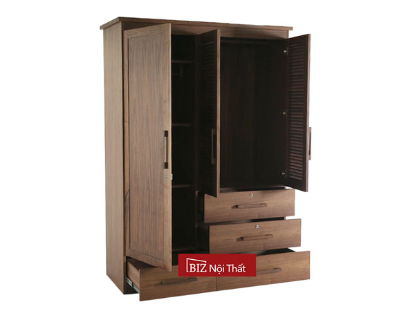 Tủ được thiết kế với 3 cánh cửa lớn đóng/mở, bên dưới là 4 ngăn kéo với các cánh có tay cầm dễ sử dụng. Tủ có nhiều ngăn giúp bạn phân chia quần áo tiện lợi, gọn gàng ngăn nắp. Ngoài ra, bên trong tủ còn được thiết kế thanh ngang chắc chắn, giúp treo áo khoác đứng dáng, phẳng phiu.
